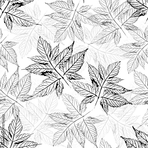 Delicate pattern with openwork maple leaves on a white background. Prints of skeletonized leaves in black and gray are chaotically arranged. For fabric, textile, wallpaper, cover, wrapping paper.