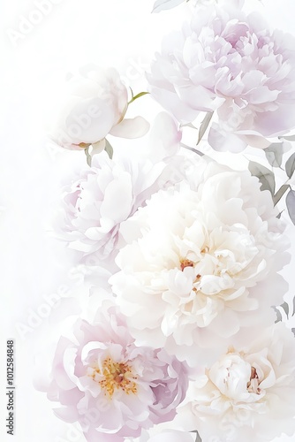 Delicate peonies bloom softly, showcasing shades of white and pale pink, ideal for spring themes and elegant decor.