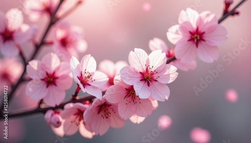 Delicate petals of cherry blossom trees gently sway, blooming, petals
