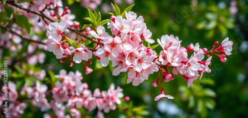 Delicate pink and white cherry blossoms on branches, lush green spring foliage, white, plant