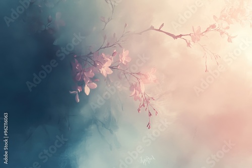 pink, blossom, blossom, flower, flower, tree branch, branch, bloom, bloom, flower petals, delicate, soft, hazy, background, pastel, colours, spring, nature, botanical, floral, light, dreamy, romantic, gentle, airy, subtile, beauty, fragile, serene, peaceful, artistic, artwork, digital, art, illustration