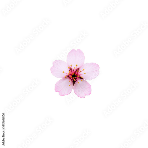Delicate pink cherry blossom flower with subtle white accents and transparency background, showcasing its intricate petals and vibrant yellow stamens