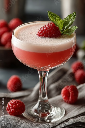 Delicate pink Clover Club cocktail with a foamy top, raspberry garnish, presented in a coupe glass on a soft neutral backdrop; minimal, clean, and artful composition.