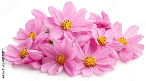 Delicate pink cosmos flowers arranged beautifully against a clean white background showcasing their vibrant colors and natural beauty.