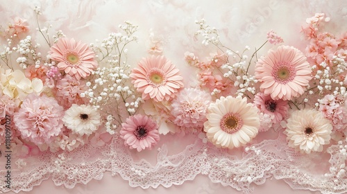 flower, pink, gerbera, daisy, carnation, lace, border, floral, arrangement, delicate, pastel, soft, romantic, beauty, elegance, spring, summer, blossom, bloom, flower petals, texture, background, design, wallpaper, feminine, wedding, celebration, decoration, nature, botany, vibrant, fresh, pretty, gentle, light, artistic, lovely, image, photo, picture, graphic