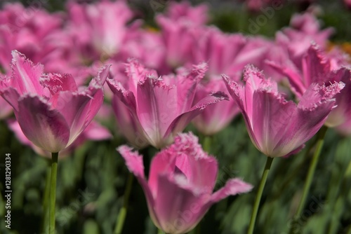 Delicate Pink Fringed Tulips Close-up with Garden Depth Effect