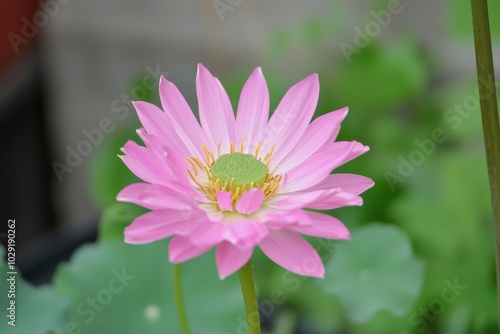 Delicate pink lotus blossom emerging gracefully in tranquil garden pond during summer