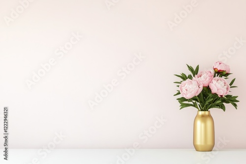 Delicate pink peonies in elegant gold vase against soft pastel b