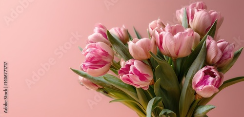 Delicate pink tulips arranged in a charming bouquet against a soft pastel pink backdrop, celebration, lovely