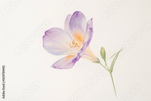 Delicate purple freesia flower and bud minimalist artwork on white background, celebrating the beauty of nature through simplicity