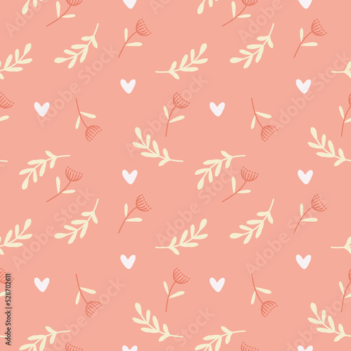 Delicate seamless pattern of wild flowers, twigs and hearts on a bright background. Perfect for textile, fabric, surface, wallpaper, scrapbooking. Vector illustration.