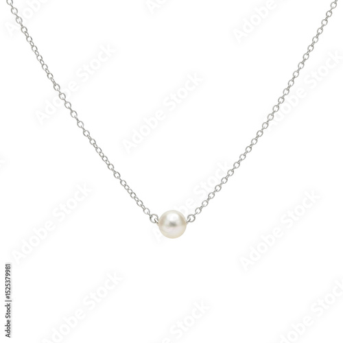 Delicate silver chain necklace, minimalist design, single spherical white pearl, iridescent, on a transparent seamless isolated background, studio lighting, elegant jewelry product photography