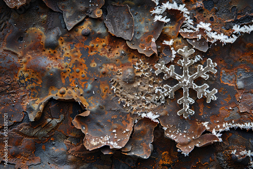 snowflake, corroded, metal, contrast, delicate, fragility, decay, texture, rust, winter, cold, nature, pattern, flake, intricate, crystal, iron, weathered, natural, beauty, sharp, macro, brown, orange, preservation, uniqueness, ice, glacé, weather, season, change, permanence, impermanence, transformation, detailed, organic, ephemeral, transitory, artistic, elemental, fleeting, hard-wearing, textured, surface