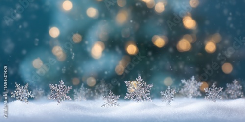 Delicate Snowflake on Frosty Winter Background with Bokeh Lights