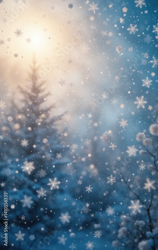Delicate snowflakes gently cascade from a gray winter sky, blanketing the ground in a soft, white layer. The serene scene evokes a peaceful, wintry atmosphere.