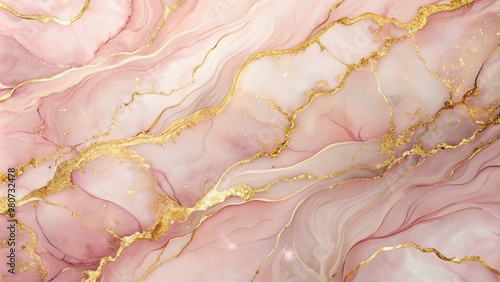 Delicate soft pink watercolor paint blends with golden lines, creating a mesmerizing abstract marble texture with subtle shimmer and elegance.