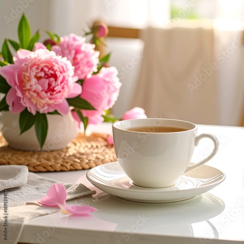 tea, cup, teacup, flower, peony, pink, spring, morning, breakfast, table, cosy, aesthetic, home, still life, delicate, beauty, relaxation, drink, refreshment, calm, quiet, light, interior, nature, elegant