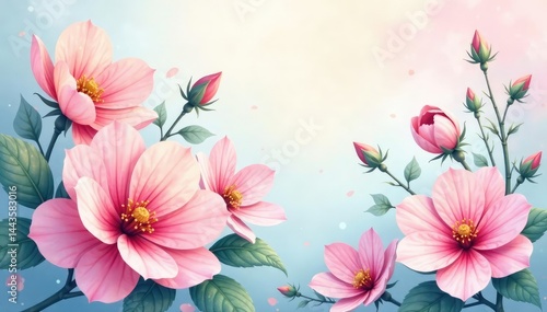 Delicate watercolor floral wallpaper, pastel hues, illustration, house