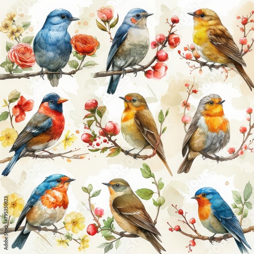 Delicate watercolor painting showcasing a collection of birds perched on flowering branches, capturing their colorful feathers and serene beauty.