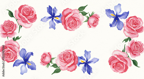 flower, floral, rose, iris, pink, blue, green, leaf, flower petals, bloom, blossom, border, frame, decorative, illustration, watercolor, painted, elegant, beautiful, pretty, delicate, romantic, natural, gentle, soft, charming, lovely, design, pattern, artwork, botanical, nature, cream, white, background, ornament, artistic, greeting, invitation, wedding, celebration