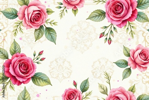 Delicate watercolor roses repeat on vintage damask , romantic, elegance, graphic