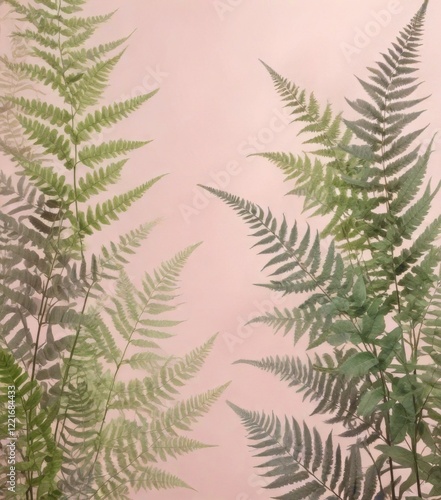 Delicate watercolor-inspired floral design featuring ferns and foliage on a pastel pink background, romantic, fern, floral