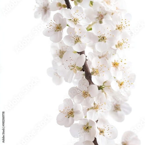 Delicate white blossoms cluster on a slender branch against a stark white background