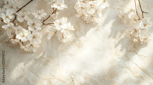 Delicate white blossoms on a textured background. Soft light creates gentle shadows.
