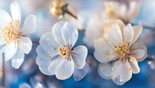 Delicate white blossoms with golden centers bloom against a soft blue backdrop. Water droplets cling to the petals, adding a touch of freshness and vibrancy to the scene.