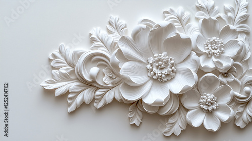 Delicate white floral relief sculpture, showcasing intricate details and textures, ideal for modern decor. white floral plaster rosettes, interior design elements and decorations.