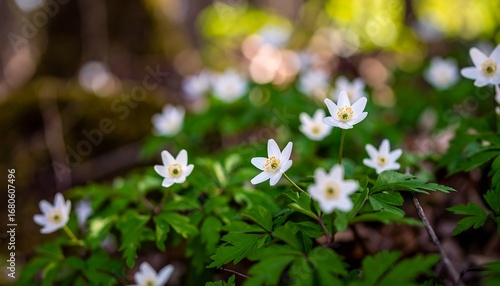 Delicate white flowers bloom amidst lush green foliage in a forest setting.