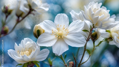 Delicate white flowers in bloom against a soft blue background showcasing their natural beauty and elegance in spring.