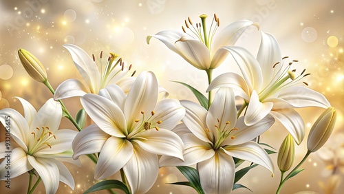 Delicate white lily flowers bloom against a soft, creamy background, their elegant petals and golden anthers creating a striking organic pattern.
