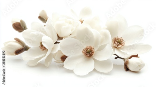 Delicate white magnolia blossoms and buds arranged on a bright, clean background. A soft, elegant floral display