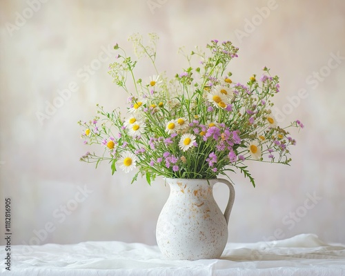 Delicate wildflower arrangement in vintage pitcher home decor floral art soft lighting aesthetic beauty