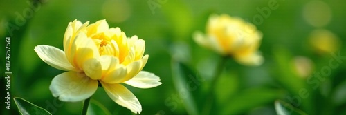 Delicate yellow peony flowers against a lush green background, white, yellow, organic