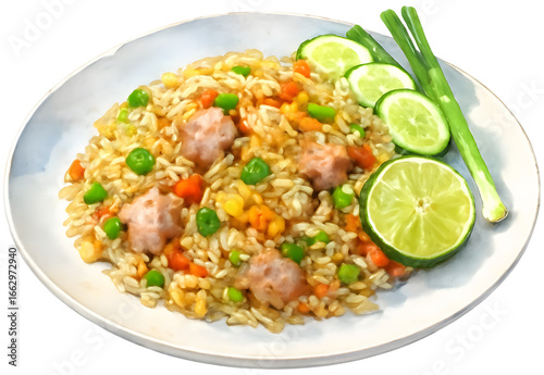 fried rice, vegetable, meatball, green onion, lime, plate, dish, cookery, food, meal, cooking, preparation, colourful, stir fry, epicure, lunchtime, wholesome, savoury, asian cuisine, ingredient, dining, eatery, culinary, garnishing, fresh, appetising, delicious, green, vibrant, healthy, favor, side dish, comfort food, homemade, nourishment, receipe, presentation, tasty, flavorful, healthy lifestyle