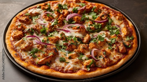 Delicious and gourmet chicken tikka pizza freshly baked with toppings on a black plate