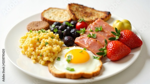 Delicious and Healthy Breakfast Plate with Fried Egg, Toast, Ham, Couscous, and Berries