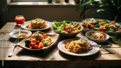 Delicious and Healthy Meals Placed On A Wooden Table For a Meal