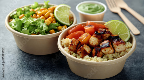 grilled chicken, salad, health food, healthy eating, lunch, dinner, take-out, delicious, alimentary, tasty, fresh, vibrant, colourful, lime, corn, tomatoes, protein, food photography, healthy lifestyle, weight loss, diet food, epicure, organic, sustainable, environmentally friendly