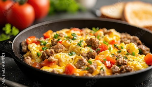 Delicious and hearty breakfast of scrambled eggs with sausage, peppers, and onions.