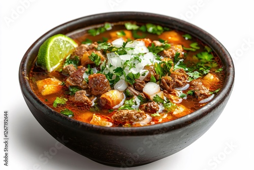 stew, beef, mexican, lime, cilantro, bowl, rustic, food, cookery, dish, meal, dinner, lunch, soup, vegetable, onion, meat, broth, garnish, parsley, fresh, ingredient, cooking, culinary, epicure, healthy, homemade, spicey, tasty, traditional, vibrant, close, up, studio, shot, isolated, white, background, delicious, hearty, component, portion, serving, presentation, nobody, gastronomy, plate