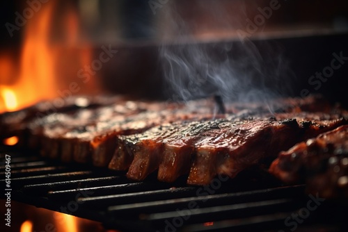 delicious and tasty ribs being cooked on a barbacue grill in the american style