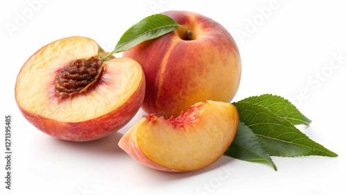 peach, fruit, red, yellow, fuzzy, skin, green leaf, sliced, ripe, fresh, juicy, health food, snack, ingredient, vitamin, nourishment, diet, vegetarian, vegan, delicious, appetising, tasty, flavorful, sweet, raw, uncooked, agriculture, botany, natural, organic, wholesome, vibrant, colourful, studio shot, closeup, macro, detail, clip art, graphic, design, illustration, peach, food, isolated, white