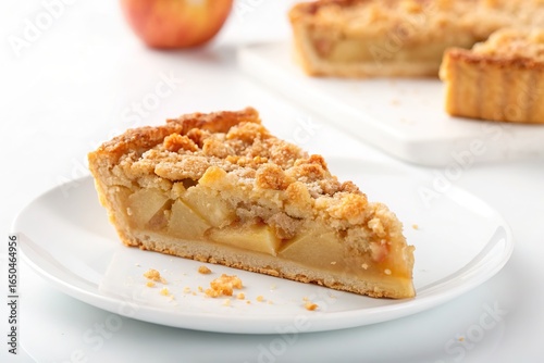 Delicious apple crumble pie slice on a white plate with whole pie in the background