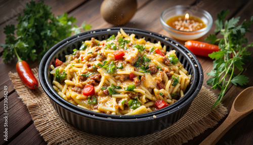 Delicious arroz carreteiro served in bowl on rustic table, culinary delight