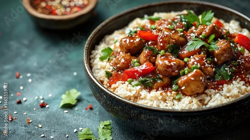 chicken, stir fry, rice, asian cuisine, health food, dinner, homemade, delicious, flavorful, garnish, sesame seeds, meal, protein, cooked, alimentary, tasty, dinnerware, vegetable, red pepper, cilantro, seasoning, savoury, chef, kitchen, closeup, cookery, ingredient, fresh, eating, appetising, culinary, healthy eating, exotic, spice, epicure, classic