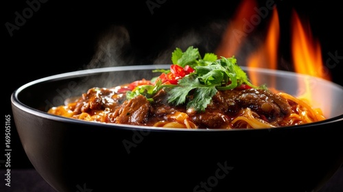 noodle, beef, presentation, coriander, chinese food, chili pepper, hot, steaming, bowl, food, cookery, asian cuisine, asian cuisine, dish, meal, dinner, lunch, spicey, fire, flames, dark background, black background, eatery, epicure, tasty, delicious, healthy, nourishment, eating, cooked, prepared, served, culinary, gastronomy, receipe, ingredient, freshness, aroma, favor, heat, smoke, vapour, closeup, meat, garnish, vegetable, pork meat, cooking