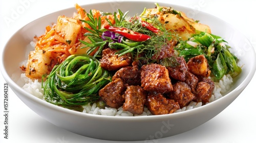 Delicious Asian Rice Bowl with Tofu, Kimchi, and Fresh Vegetables on White Background